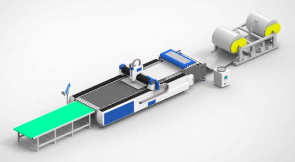 激光切割自動旋轉(zhuǎn)機床(俗稱;全自動卷料光纖激光切割機廠家,提供旋轉(zhuǎn)平臺光纖激光切割機,全自動卷料送料激光切割機,卷料激光切割生產(chǎn)線 滾動臺面光纖激光切割機,自動上料激光切割機,風管激光切割機自動上料下料,通風管道風管激光切割生產(chǎn)線,風管激光開料機,通風管道光纖激光下料機,卷材全自動激光切割機送料設備):包括卷料料架,校平裝置,激光機床床體、接料平臺,自動刀條旋轉(zhuǎn)組件;工作原理:首次入料卷料通過校平機校平后進入激光切割平臺進行切割,切割完成后校平機自動送料,旋轉(zhuǎn)平臺自動把切割完成的配件輸送到接料平臺,校平機送料完成后系統(tǒng)運行切割第二張排版圖料件,同時可進行切好料件的編號收集工作,以此往復工作大大提高整體加工速度及效率。
